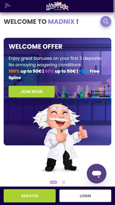 A plataforma do cassino é totalmente funcional e fácil de usar, abrir uma conta é simples e super-rápido, e a experiência no cassino foi bastante agradável. Gostamos da simplicidade do design, que é enriquecido por um avatar adorável – o Prof. NIX, que lembra muito um cientista que todos conhecemos.