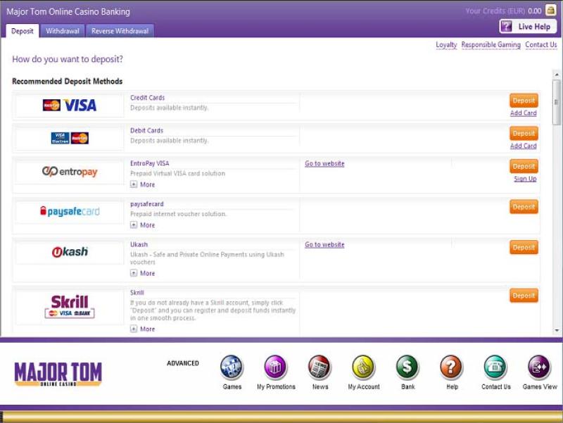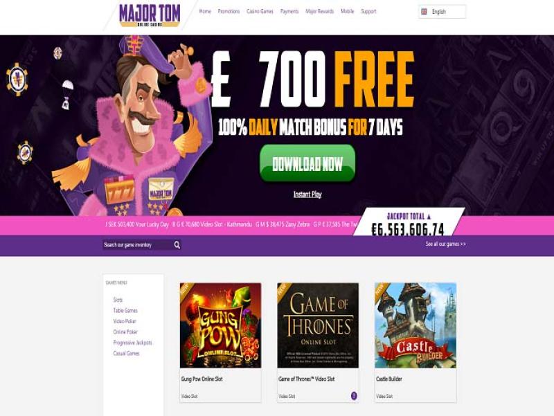 Se você é fã dos caça-níqueis da Microgaming (eu sou), este é um ótimo cassino para começar a jogar. O Major Tom é irmão do Red Flush e do La Vida. Recebo muitos e-mails promocionais deles.