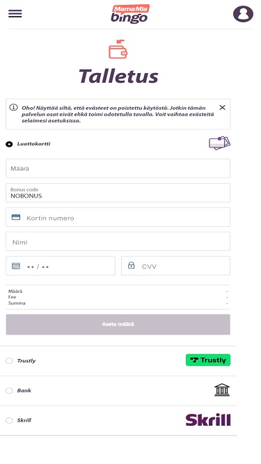 MamaMia Bingo não aceita jogadores dos seguintes países: Afeganistão, Alabama, Ilhas Aland, Alasca, Albânia, Alberta, Alderney, Argélia, Samoa Americana, Andorra, Angola, Anguilla, Antártica, Antígua e Barbuda, Argentina, Arizona, Arkansas, Armênia, Aruba, Austrália, Áustria, Azerbaijão, Bahamas, Bahrein, Bangladesh, Barbados, Bielorrússia, Bélgica, Belize, Benim, Bermudas, Butão, Bolívia, Bósnia e Herzegovina, Botsuana, Ilha Bouvet, Brasil, Colúmbia Britânica, Território Britânico do Oceano Índico, Brunei, Bulgária, Burkina Faso, Burundi, Califórnia, Camboja, Camarões, Canadá, Cabo Verde, Ilhas Cayman, República Centro-Africana, Chade, Chile, China, Ilha Christmas, Ilhas Cocos (Keeling), Colômbia, Colorado, Comores, Congo, República Democrática do Congo, Connecticut, Ilhas Cook, Costa Rica, Costa do Marfim, Croácia, Cuba, Curaçao, Chipre, República Checa, DC, Delaware, Dinamarca, Djibuti, Dominica, República Dominicana, Equador, Egito, El Salvador, Guiné Equatorial, Eritreia, Estônia, Etiópia, Ilhas Falkland (Malvinas), Ilhas Faroé, Fiji, Flórida, França, Guiana Francesa, Polinésia Francesa, Territórios Franceses do Sul, Gabão, Gâmbia, Geórgia, Geórgia, Alemanha, Gana, Gibraltar, Grécia, Groenlândia, Granada, Guadalupe, Guam, Guatemala, Guiné, Guiné-Bissau, Guiana, Haiti, Havaí, Ilha Heard e Ilhas McDonald, Honduras, Hong Kong, Hungria, Islândia, Idaho, Illinois, Índia, Indiana, Indonésia, Iowa, Irã, Iraque, Irlanda, Ilha de Man, Israel, Itália, Jamaica, Japão, Jersey, Jordânia, Kansas, Cazaquistão, Kentucky, Quênia, Kiribati, Coreia, República Popular Democrática da, Coreia, República da, Kuwait, Quirguistão, Laos, Letônia, Líbano, Lesoto, Libéria, Líbia, Liechtenstein, Lituânia, Luisiana, Luxemburgo, Macau, Madagáscar, Maine, Malawi, Malásia, Maldivas, Mali, Malta, Manitoba, Ilhas Marshall, Martinica, Maryland, Massachusetts, Mauritânia, Maurício, Mayotte, México, Michigan, Micronésia, Estados Federados da, Minnesota, Mississipi, Missouri, Moldávia, Mônaco, Mongólia, Montana, Montenegro, Montserrat, Marrocos, Moçambique, Mianmar, Namíbia, Nauru, Nebraska, Nepal, Holanda, Antilhas Holandesas, Nevada, Nova Brunswick, Nova Caledônia, Nova Hampshire, Nova Jersey, Novo México, Nova Iorque, Nova Zelândia, Terra Nova e Labrador, Nicarágua, Níger, Nigéria, Niue, Ilha Norfolk, Carolina do Norte, Dakota do Norte, Macedônia do Norte, Ilhas Marianas do Norte, Territórios do Noroeste, Noruega, Nova Scotia, Nunavut, Ohio, Oklahoma, Omã, Ontário, Oregon, Paquistão, Palácio, Palestina, Panamá, Papua Nova Guiné, Paraguai, Pensilvânia, Peru, Filipinas, Pitcairn, Polônia, Portugal, Ilha do Príncipe Eduardo, Porto Rico, Catar, Quebec, Reunião, Rhode Island, Romênia, Rússia, Ruanda, Santa Helena, São Cristóvão e Nevis, Santa Lúcia, São Martinho, São Pedro e Miquelon, São Vicente e Granadinas, Samoa, São Marino, São Tomé e Príncipe, Saskatchewan, Arábia Saudita, Senegal, Sérvia, Seicheles, Serra Leoa, Cingapura, Eslováquia, Eslovênia, Ilhas Salomão, Somália, África do Sul, Carolina do Sul, Dakota do Sul, Ilhas Geórgia do Sul e Sandwich do Sul, Sudão do Sul, Espanha, Sri Lanka, Sudão, Suriname, Svalbard e Jan Mayen, Suazilândia, Suíça, Síria, Taiwan, Tajiquistão, Tanzânia, Tennessee, Texas, Tailândia, Timor-Leste, Ir, Toquelau, Chegado, Trinidad e Tobago, Tunísia, Peru, Turcomenistão, Ilhas Turks e Caicos, Tuvalu, Uganda, Ucrânia, Emirados Árabes Unidos, Reino Unido, Estados Unidos, Ilhas Menores Distantes dos Estados Unidos, Uruguai, Utah, Uzbequistão, Vanuatu, Vaticano, Venezuela, Vermont, Vietnã, Ilhas Virgens Britânicas, Ilhas Virgens, EUA, Virgínia, Wallis e Futuna, Washington, Virgínia Ocidental, Saara Ocidental, Wisconsin, Wyoming, Iémen, Iugoslávia, Território de Yukon, Zâmbia e Zimbábue.