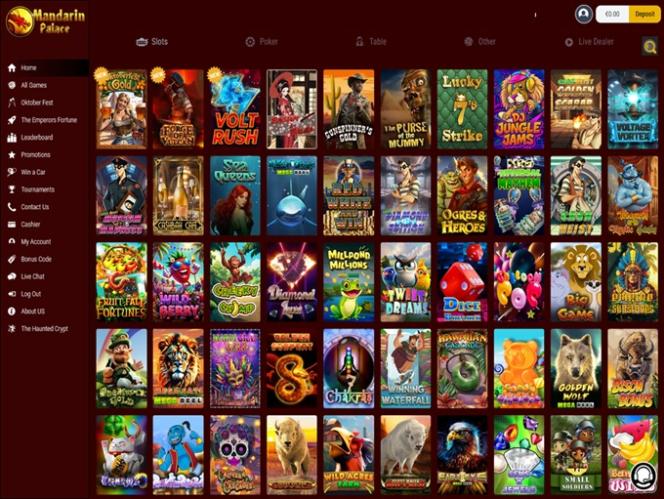 Os caça-níqueis representam uma grande parte do catálogo do Mandarin Palace Casino, consistindo principalmente de caça-níqueis de vídeo. Os jogos são, em sua maioria, o que você esperaria de um cassino online, embora existam jogos como Arcadia que parecem únicos.