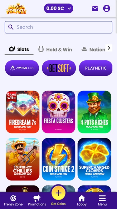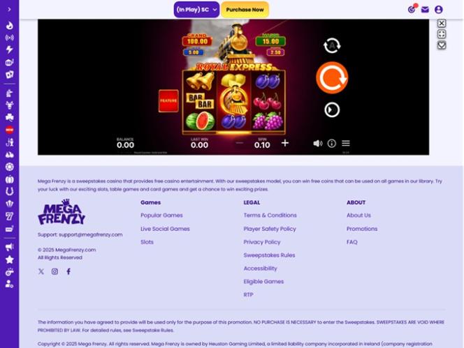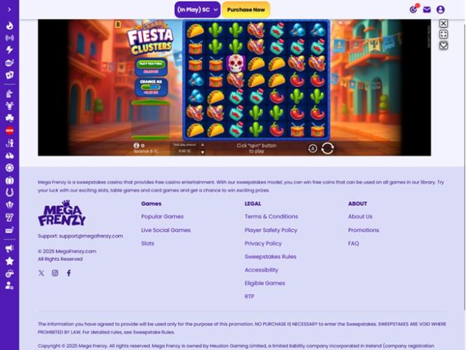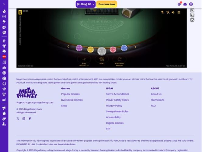 Fundado em 2025, o Mega Frenzy Casino é um enorme cassino de sorteios que oferece uma ampla variedade de opções de jogos: você vai adorar se curte slots inovadores como Megaways e até mesmo jogos com crupiês ao vivo como Gravity Blackjack e Sic Bo. A marca aceita jogadores dos Estados Unidos (com exceção de alguns estados) e oferece uma seleção completa de slots online no estilo cassino e jogos com crupiês ao vivo, além de um robusto programa promocional com bônus, eventos e diversas outras recompensas.