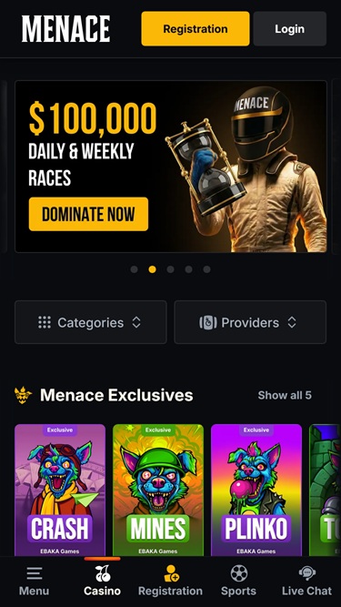 Na aba de promoções do cassino, você encontrará ofertas de bônus atraentes para apostas esportivas, caso esteja interessado em aumentar suas chances de ganhar dessa forma. Além disso, se você gosta de experimentar jogos de cassino com bônus ativos, saiba que aqui você pode contar com uma generosa oferta de boas-vindas que pode ser usada nos seus quatro primeiros depósitos no cassino Menace King.