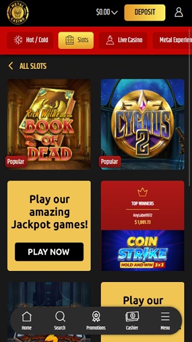 O Metal Casino é alimentado por Microgaming, Net Entertainment, Playtech, BetSoft, 1x2gaming, Barcrest, Big Time Gaming, ELK Studios, Evolution Gaming, EYECON, Ezugi, Habanero Systems, lightningboxgames, Novomatic, Oryx, Play'n GO, playson, Quickspin, Relax Gaming, Thunderkick, Yggdrasil, Wazdan, Realistic Games, Booming Games, Stakelogic, Pragmatic Play, Nolimit City, Red Tiger Gaming, IGT, Fantasma Games, Kalamba, Spin Games, Spadegaming, Triple Edge Studios, BGAMING, Northern Lights Gaming, Stormcraft Studios, Switch Studios, Electric Elephant Games, Pocket Games Soft, Bulletproof Games, All41 Studios, Gluck Games, Gameburger Studios, Pulse 8 Studios, Neon Valley Studios, Golden Rock Studios, Spearhead Studios, Shuffle Master, SpinPlay Games, GONG Gaming, Blue Guru Games, Lady Luck Games, Games Global, Amusnet Interactive, 2by2 Gaming, Ash Gaming, bluberi, EveryMatrix, Greentube, Merkur Gaming, NextGen, NYX Interactive, Push Gaming, Skill on Net, Inspired Gaming, Gaming Realms, Cayetano, SG Interactive, Gamomat, CORE Gaming, Scientific Games, Reel Time Gaming, Authentic Gaming, Bally Wulff, Iron Dog Studio, Old Skool Studios, Foxium, Betdigital, Zitro, Just For The Win, Reflex Gaming, Storm Gaming Technology, PearFiction Studios, Wild Streak Gaming, Slingshot Studios, Golden Hero, Fortune Factory Studios, Green Jade Games, STHLM Gaming, 4ThePlayer, AvatarUX, Gamevy, Crazy Tooth Studio, ReelPlay, Japan Technicals Games, Alchemy Gaming, Rarestone Gaming, BB Games, Black Pudding Games, Snowborn Games, Hacksaw Gaming, Max Win Gaming, Gold Coin Studios, Bang Bang Games, Copacabana Gaming, Ipanema Gaming, Half Pixel Studios, Peter And Sons, Eurostar Studios, Aurum Signature Studios, Armadillo Studios, Lucksome Gaming, Area Vegas, Wishbone Games, Apparat Gaming, Spribe, Circular Arrow, Print Studios, Gaming Corps, HammerTime Games, Four Leaf Gaming, INO Games, Nailed It! Games, Atomic Slot Lab, Neko Games, Reel Kingdom, Oros Gaming, Givme Games, JVL and Light & Wonder e os jogos do casino são disponibilizados através de uma plataforma de jogo instantâneo baseada na web, que carrega diretamente no seu navegador de internet. O casino também é totalmente compatível com dispositivos móveis, permitindo-lhe aceder aos jogos através do seu smartphone ou tablet.