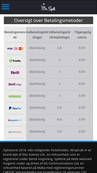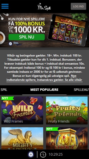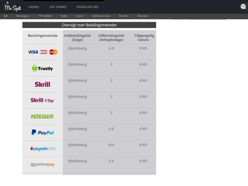 O cassino MR Spil, eu acho, é do mesmo grupo que o cassino karamba-hopa etc., mas é um grupo muito bom e confiável! Jogos e promoções muito bons para oferecer! Bônus de boas-vindas muito bom com apenas 35x a aposta, o que é realmente ótimo! Cassino fácil, mas com bom design, tudo é fácil de encontrar! O suporte também é muito amigável! E sempre prestativo;) Como eles oferecem NetEnt, eles se tornaram muito atraentes para jogar lá! Os pagamentos sempre me são enviados em 4 a 5 horas para a carteira eletrônica. No começo, nunca esperei que me pagassem, mas fiquei muito feliz em receber meus fundos muito rápido! A verificação de documentos também é muito rápida! Também há rodadas grátis e bônus oferecidos de tempos em tempos, um bom lugar para jogar e se divertir!