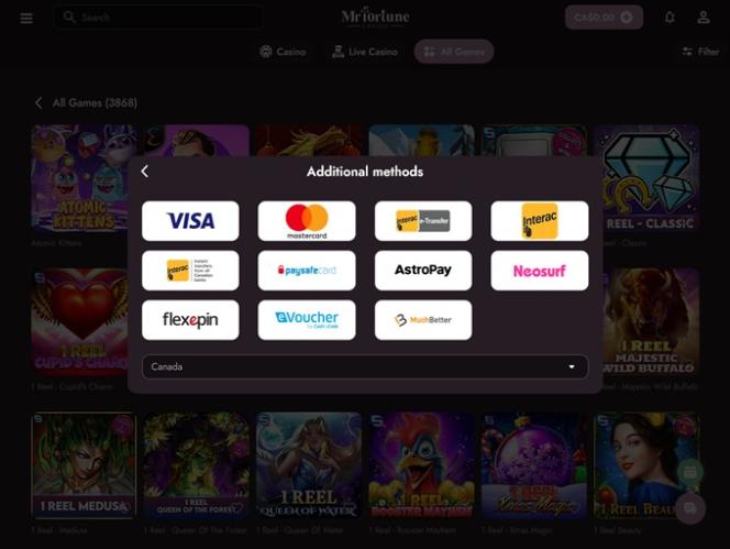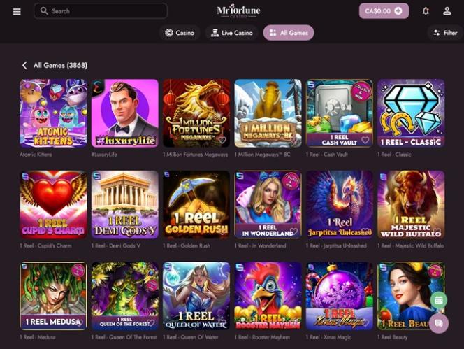 A biblioteca de jogos do cassino oferece uma rica seleção de jogos de caça-níqueis. Alguns dos títulos em destaque que você pode experimentar no MrFortune são: Joker's Jewels, Booming Bananas, Royal Fruits MultiLines, Master Joker, Jumbo Joker, Booming Seven Deluxe, Classic Coins, 2x Points, Thunder Coins: Hold and Win, Joker's Jewels Hot, Gold Gold Gold 5000, Inner Fire, Joker's Jewels Wild, Burning Classics Royal Edition, Cashpot Strike 7s, Peppe's Pepperoni Pizza Plaza, Buffalo Hold and Win Extreme 10,000, All-Star Fruits, Jewelling Diamonds, Book Of Camelot, Tropical Thunder…