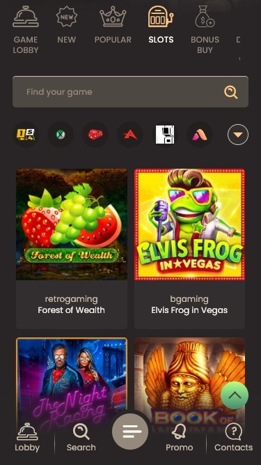 Organizado em categorias, o lobby é fácil de navegar. Os jogos podem ser pesquisados por gênero, estúdio ou por recursos específicos, como Drops & Wins e Compra de Bônus.