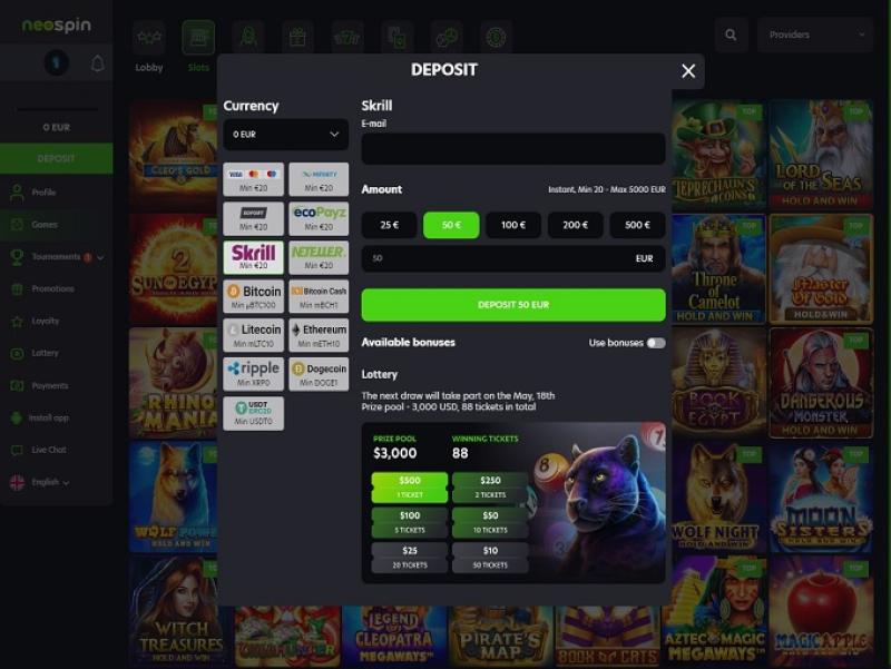 Além do programa de fidelidade VIP da Neospin, que oferece loot boxes com jogos de azar atraentes, os jogadores ativos podem participar de torneios e da loteria do cassino, resgatar rodadas grátis semanais, um bônus de recarga semanal e cashback. Observe que os ganhos obtidos com o bônus de cashback não têm limite máximo de saque.