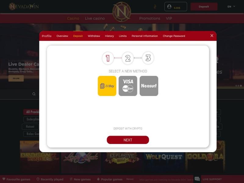 O NevadaWin Casino possui tempos de saque satisfatórios e oferece suporte a diversas opções bancárias populares para depósitos e saques, incluindo pagamentos com criptomoedas, como mencionado anteriormente, além de cartões de débito e crédito, carteiras eletrônicas, transferências bancárias e opções bancárias com criptomoedas.
