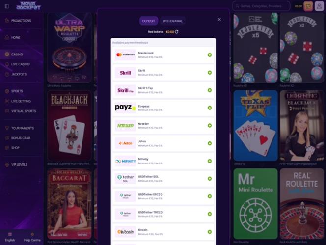Como mencionado, o cassino oferece uma excelente seleção de métodos de pagamento amplamente utilizados. Embora as opções bancárias variem de acordo com o país, a grande variedade disponível proporciona alternativas mais do que suficientes para todos os jogadores, independentemente de sua localização.