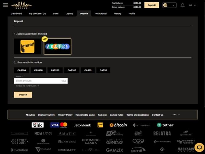 O Pan Casino aceita diversas moedas fiduciárias e digitais, incluindo Cardano, Bitcoin Cash, Bitcoin, Dólar Canadense, Ethereum, Litecoin, Zloty Polonês, Solana, Toncoin, TRON, USD Coin, Tether, XRP…