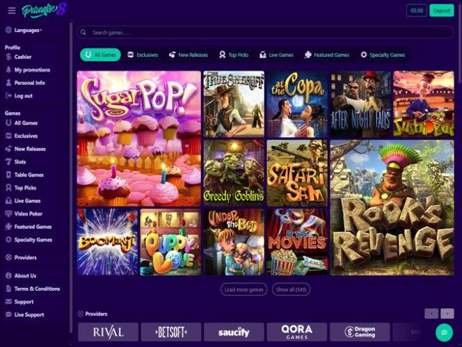 O Paradise 8 Casino é alimentado por BetSoft, Genesis Gaming, Rival, Saucify, Vivo Gaming, Arrows Edge, Radi8 Games, Fresh Deck Studios, Woohoo Games, Qora Games, Genii and Dragon Gaming , que permite aos jogadores jogar através de softwares para download, bem como no modelo de jogo instantâneo.Outros jogos