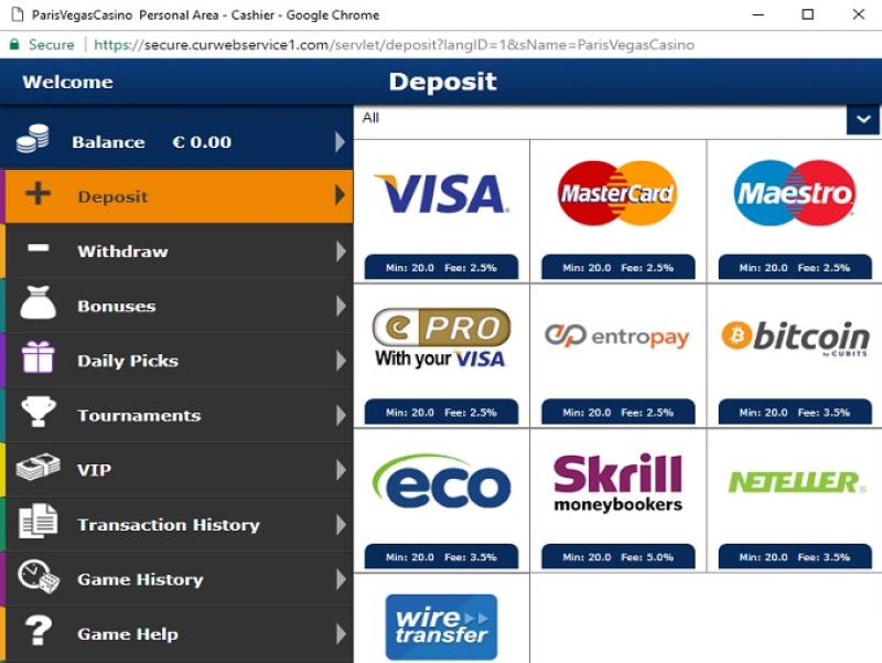 O Paris Vegas Casino é operado pela NextGen and Skill on Net e seus jogos são oferecidos por meio de um software para download, bem como por uma plataforma de jogo instantâneo que permite jogar pelo navegador da web. Jogadores em dispositivos móveis também podem acessar o cassino por meio de seus smartphones e tablets.Opções bancárias no Paris Vegas Casino