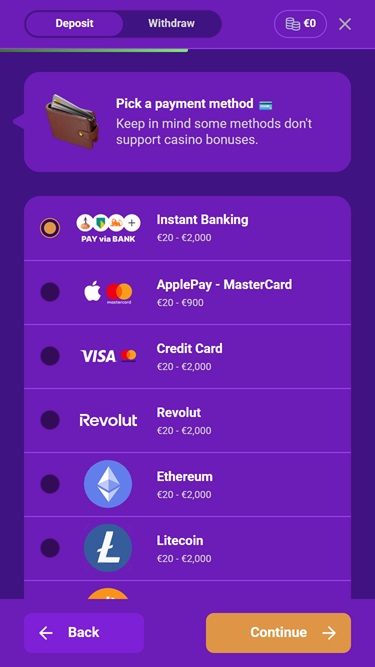 O caixa do cassino oferece diversas opções de pagamento tradicionais e em criptomoedas, incluindo Apple Pay , transferência bancária, Google Pay, cartões de crédito e débito populares, entre outras. Em relação às moedas, você pode fazer depósitos e saques usando Cardano, Bitcoin Cash, Bitcoin, Dogecoin, Ethereum, Litecoin, Solana, Tron, USD Coin, Tether e Ripple. Dólares canadenses também são uma opção disponível.