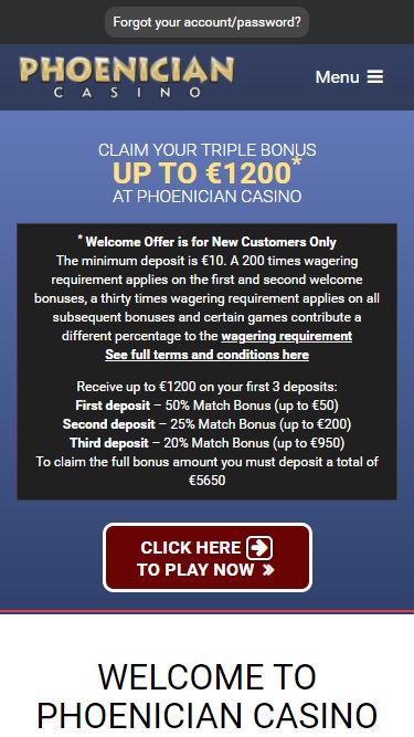 O Phoenician Casino abriu as suas portas há alguns anos e tornou-se conhecido como um dos pilares do portfólio de casinos online da Casino Rewards. Os jogadores que frequentam o Phoenician Casino desfrutam da gestão estável do casino, das boas opções bancárias e da vasta biblioteca de jogos da Microgaming.Informações do cassino