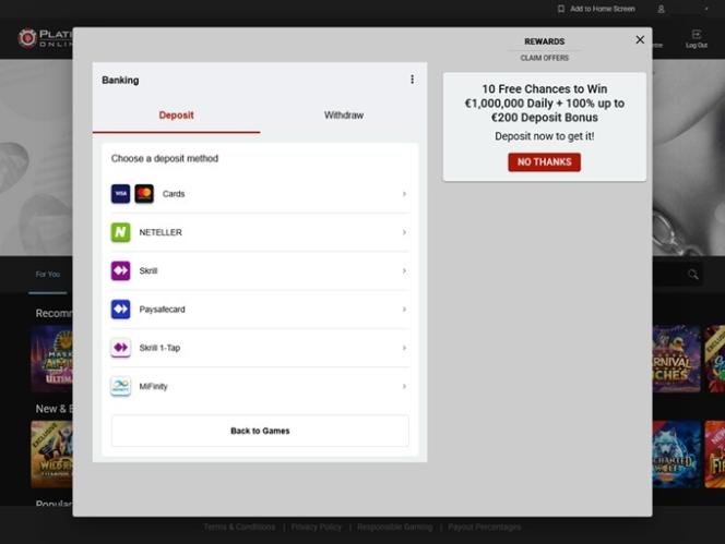 O PlatinumPlay faz parte do renomado grupo Fortune Lounge, que também inclui cassinos famosos como o Royal Vegas. Não gosto muito de ofertas de jogo grátis como as do PlatinumPlay Casino, onde você pode transferir seus ganhos para a seção de bônus após o primeiro depósito, porque você ainda precisa apostá-los, e os requisitos de aposta só começam a valer após o depósito. Já fiz mais de 100 depósitos aqui e só saquei cinco vezes, embora uma delas tenha sido de um valor maior. A verificação e todos os saques ocorreram sem problemas. O que não gosto é do limite de saque de 50.