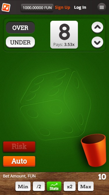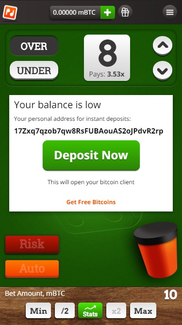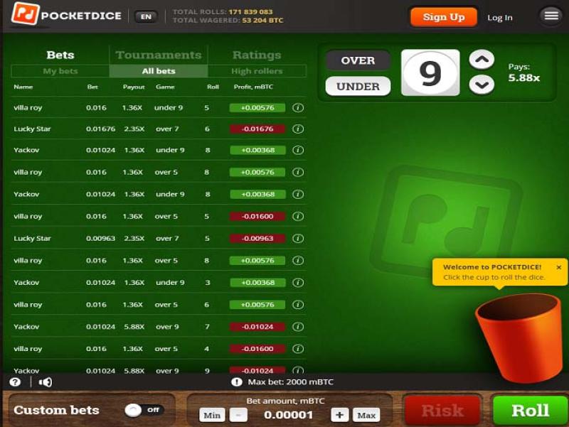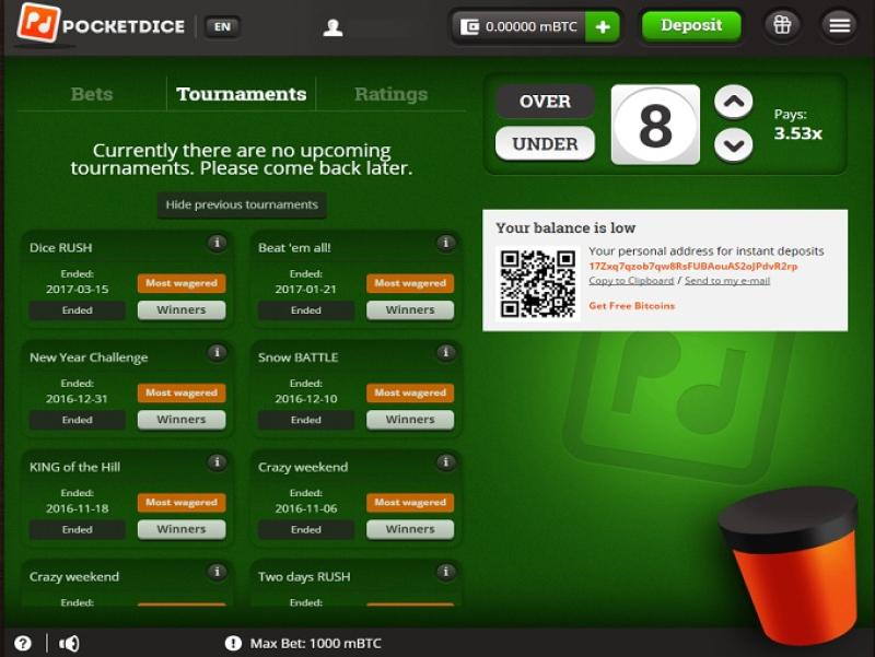 PocketDice é um site de apostas online que utiliza Bitcoin e permite aos jogadores apostar em um número selecionado, seja ele acima ou abaixo do que é sorteado em um par de dados. O site tem um layout muito simples e oferece apenas o jogo de dados, mas proporciona pagamentos instantâneos aos vencedores. O PocketDice não é regulamentado em nenhuma jurisdição e os jogadores devem ter cautela caso optem por experimentar este jogo com Bitcoin.Informações do cassino