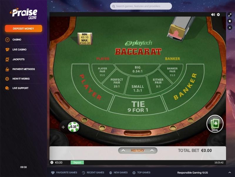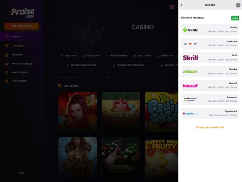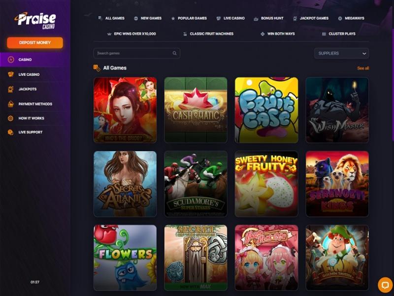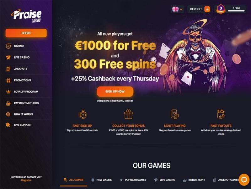 O Praise Casino oferece uma coleção crescente de mais de 4.000 jogos, abrangendo todas as principais categorias de apostas, incluindo cassino ao vivo. Com generosos bônus e promoções, além de 25 métodos de pagamento (Trustly disponível) e chat ao vivo, o Praise Casino busca oferecer os mais altos padrões do setor.
