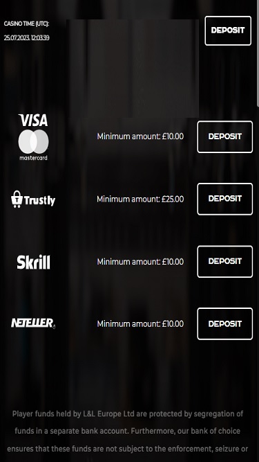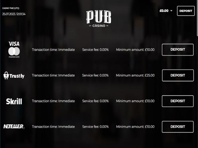 Em relação aos métodos de pagamento, os clientes do PUB Casino podem optar por utilizar métodos populares como Visa, Mastercard, Trustly, Neteller , Skrill, Apple Pay e transferência bancária. Não há opções para utilizar criptomoedas como método de pagamento.