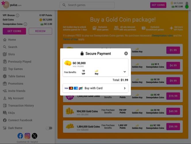 Embora você não possa usufruir de benefícios tangíveis do programa de fidelidade como jogador gratuito, pode aproveitar diversas outras promoções e bônus. Por exemplo, toda nova conta que concluir o procedimento KYC pode reivindicar um pacote de boas-vindas contendo Moedas de Sorteio e Moedas de Ouro.