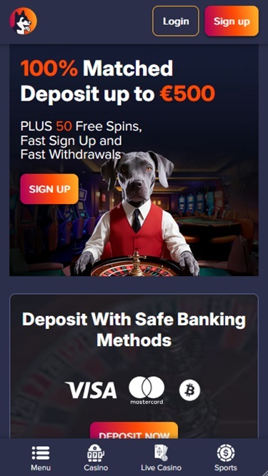 Como seria de esperar pelo nome da marca, este casino tem como tema cachorros e cães, o que confere ao website muita personalidade e charme, especialmente considerando a grande quantidade de ilustrações originais e efeitos de vídeo presentes. A interface do utilizador é fácil de navegar e os jogadores não terão problemas em aceder a todas as páginas e secções.
