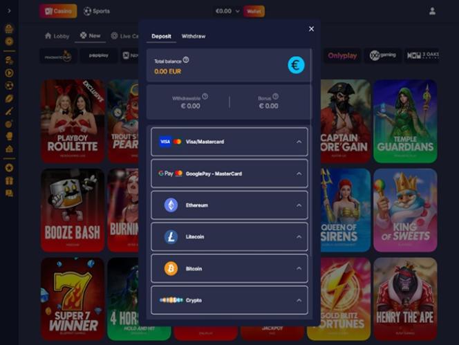 O cassino aceita moedas fiduciárias e criptomoedas.