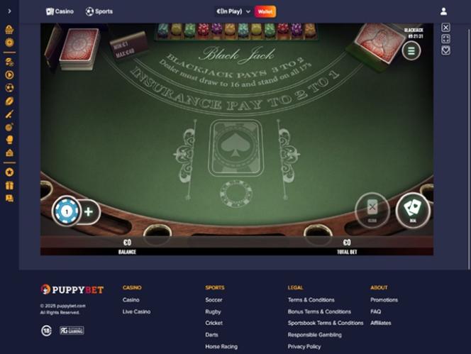 Depois de jogar bastante em caça-níqueis online e quando estiver procurando algo um pouco mais complexo, você poderá se deliciar com a seleção de jogos de mesa tradicionais da PuppyBet, como pôquer , roleta , blackjack e bacará , que podem ser jogados tanto com crupiê ao vivo quanto com computador, sendo as variações mais populares Grand Bonus Blackjack, Hyper Speed Baccarat, Royal Roulette e Poker 6+.