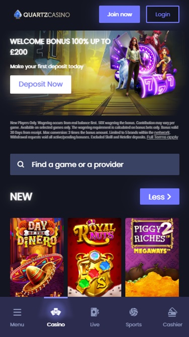 O Quartz Casino é um site de apostas online que abriu suas portas em 2014. Operado e pertencente à ProgressPlay Limited, o Quartz Casino tem uma aparência e funcionamento semelhantes aos de outros cassinos da ProgressPlay, mas ainda oferece uma grande biblioteca de jogos, possui uma administração sólida e um histórico de pagamentos consistente, o que faz do Quartz um bom site de apostas online, ainda que não seja totalmente inovador ou único.Informações do cassino