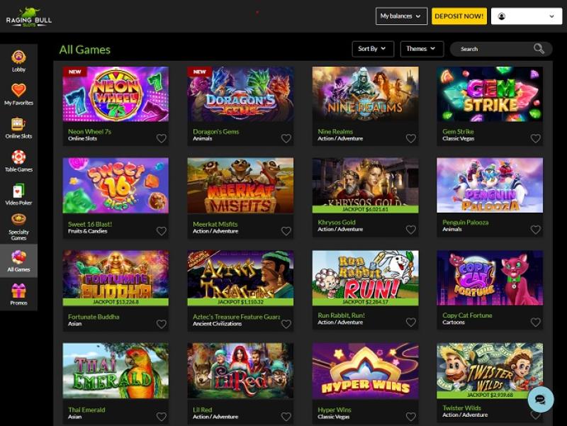 O catálogo do Raging Bull Casino é composto por uma grande seleção de slots, muitos dos quais são slots de vídeo. Há também alguns grandes jackpots progressivos para serem ganhos no Raging Bull, incluindo os prêmios Midlife Crisis, Shopping Spree e Jackpot Pinatas da RTG.