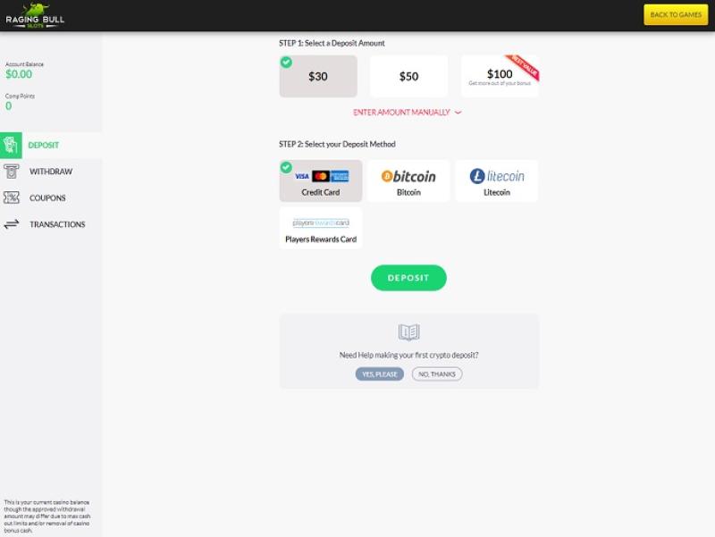 O sistema bancário é bastante decente para um cassino que atende ao mercado dos Estados Unidos, já que o Raging Bull aceita transações financeiras por meio de transferência bancária, MasterCard, Skrill, Neteller, Visa, ecoPayz e Bitcoin. O cassino exige um prazo de 72 horas para o processamento dos ganhos, mas as carteiras eletrônicas são pagas instantaneamente após esse período. As opções de transferência bancária também são processadas em um prazo que pode variar entre 5 e 10 dias úteis. Vale ressaltar que o Raging Bull Casino tem um limite de saque semanal de US$ 2.500, mas não está claro se esse limite se aplica a prêmios de jackpot.