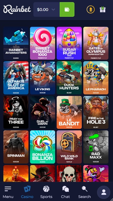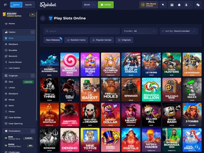 Como já mencionamos, a Rainbet oferece uma ampla seleção de jogos de cassino. Isso inclui títulos de muitos provedores renomados, como Pragmatic Play, Relax Gaming , Hacksaw Gaming, Play'n GO, Red Tiger Gaming , Spinomenal, Endorphina, Onlyplay , Booming Games e muitos outros!