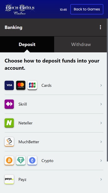 O cassino Rich Reels é uma ótima fonte de entretenimento. Na verdade, gosto da seleção de jogos e dos métodos de pagamento disponíveis, pois tudo isso me proporcionou uma ótima experiência de jogo. Sem mencionar que estou impressionado com o chat ao vivo, disponível 24 horas por dia, 7 dias por semana. No entanto, o que não gosto é que é preciso fazer o download primeiro. Não é um grande problema para mim, mas acho que não é muito conveniente para outros jogadores.