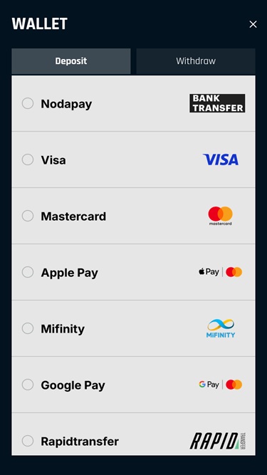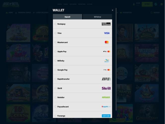 Para depositar e sacar no Rise of Bets Casino, o operador permite que os jogadores usem diversos métodos de pagamento, como Visa , Mastercard , Jeton , Mifinity , Neteller , Skrill , Paysafecard , Trustly , Payz e transferência bancária . Infelizmente, o site não aceita criptomoedas, então quem busca uma experiência com criptomoedas terá que procurar outro lugar.