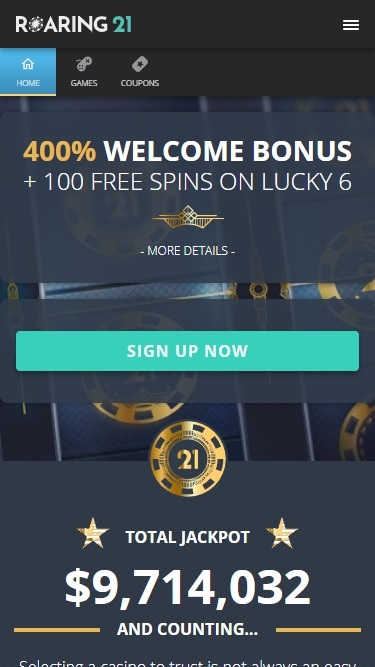 Roaring 21 Casino recebeu o selo de aprovação deste site por sua integridade e suporte ao cliente. Recomendamos apenas os melhores cassinos online em que confiamos pessoalmente e temos orgulho de sermos parceiros do Roaring 21 Casino.
