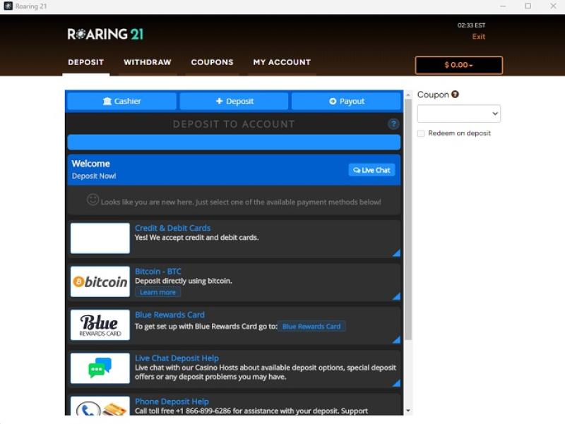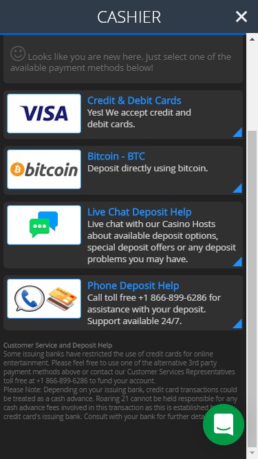 O sistema bancário do Roaring 21 é bastante decente para um cassino voltado para jogadores americanos. O site aceita depósitos e saques por cartão de crédito, transferência bancária, carteiras eletrônicas e Bitcoin. Há um período de retenção de 24 horas para os ganhos, mas o Bitcoin é pago logo em seguida. Outros métodos levam um pouco mais de tempo devido à forma como processam os fundos. Existe um limite de saque semanal de US$ 4.000.