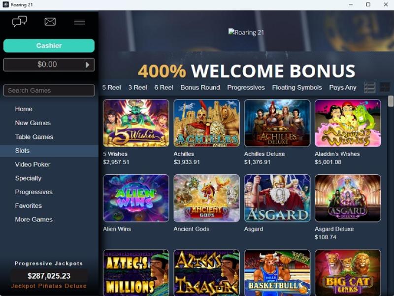 O Roaring 21 oferece uma vasta biblioteca de slots, composta por slots clássicos e de vídeo da RTG. Esses jogos apresentam diversos temas e bônus, e muitos deles contam com pequenos jackpots progressivos que podem ser ganhos. Jogadores que desejam apostar em dispositivos móveis encontrarão dezenas de slots da RTG disponíveis.