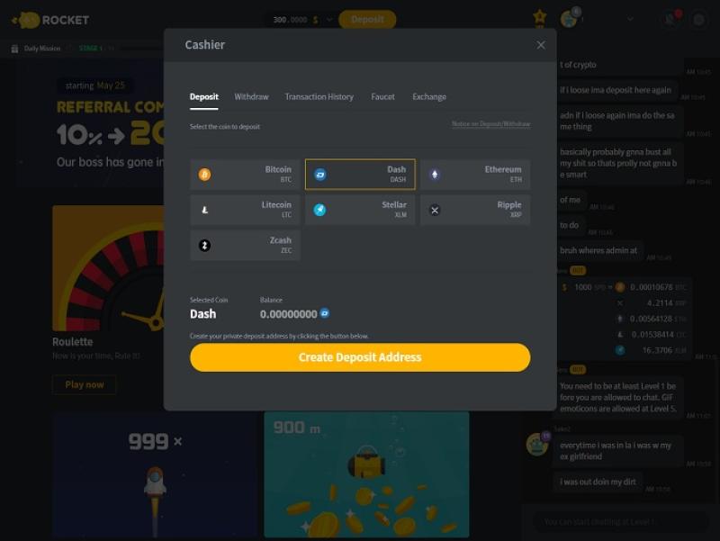 Na Rocket.run, as transações bancárias são feitas exclusivamente com criptomoedas, permitindo que os apostadores depositem e saquem usando BTC, XRP, ETH, LTC e XLM. Os pagamentos são instantâneos e não há limites de saque aparentes.