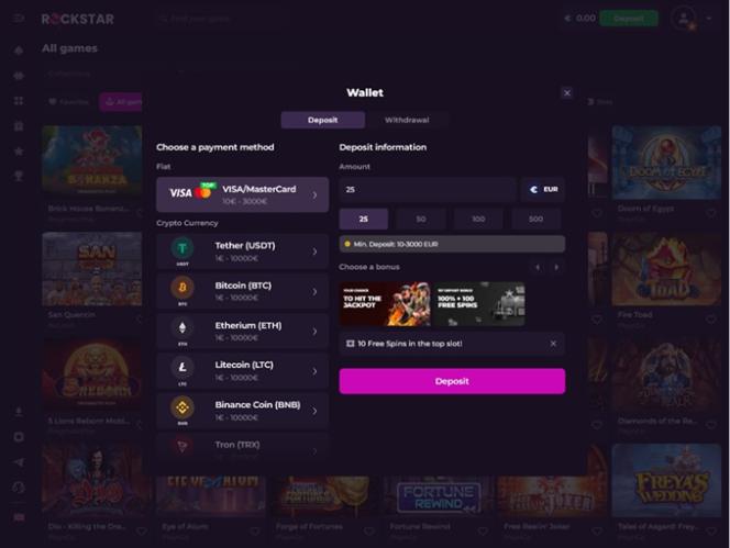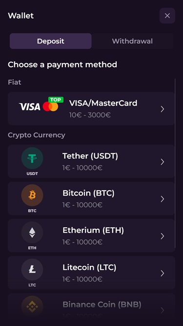 O cassino aceita tanto moedas fiduciárias quanto criptomoedas.