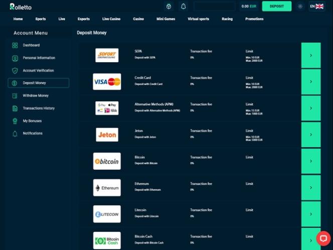 O Rolletto Casino permite que os usuários realizem transações com diversos métodos de pagamento. As opções mais populares incluem Visa , Mastercard, transferência bancária, Google Pay , Apple Pay, AstroPay, Jeton , Skrill, Neteller, Payz e Discover , entre outras. Além das opções bancárias tradicionais, o site aceita criptomoedas como Bitcoin , Bitcoin Cash , Dash , Dogecoin, Ethereum, Litecoin , USD Coin, Tether , Monero e Ripple .