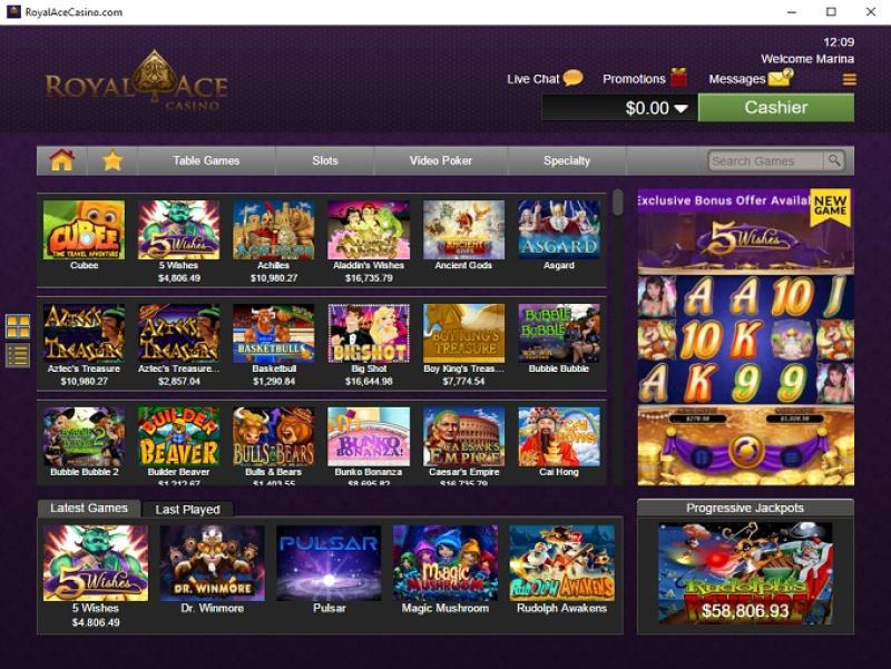 O Royal Ace Casino oferece uma grande variedade de slots para jogar, incluindo dezenas de slots de vídeo e alguns slots clássicos. Há também jackpots progressivos disponíveis, embora qualquer dinheiro ganho no casino provavelmente demore bastante tempo a chegar à sua conta bancária.