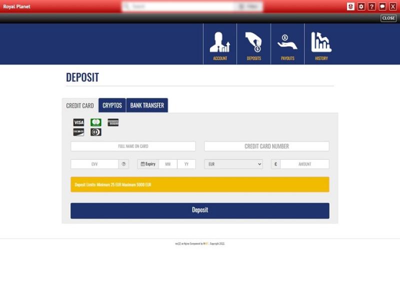 O Royal Planet Casino é um site de apostas online fundado em 2016 que oferece seus serviços a apostadores em todo o mundo. A empresa parece ter se esforçado bastante para ocultar sua identidade dos clientes, e não há informações disponíveis sobre suas licenças de jogo, o que me deixa bastante receoso em recomendar este cassino a qualquer pessoa.Informações do cassino