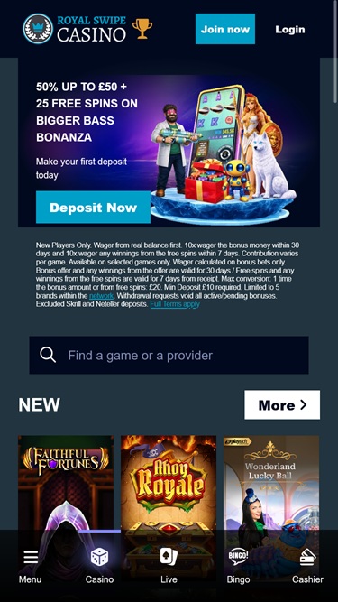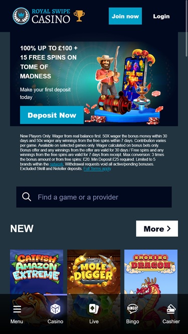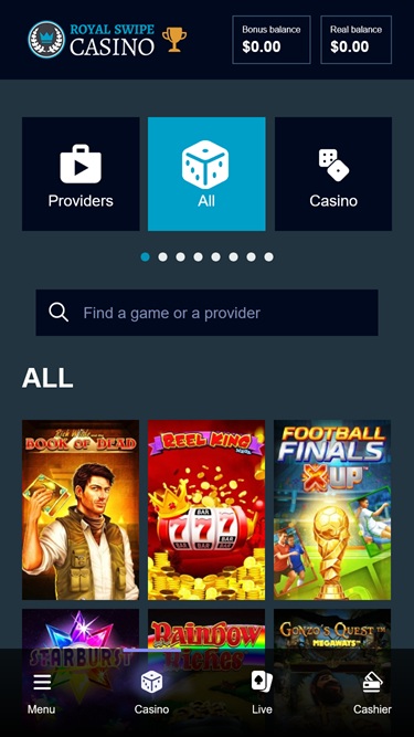 Se você já viu um, já viu de tudo. O Royal Swipe Casino é outro cassino da ProgressPlay, mas este não só tem um nome feio, como também tem um site malfeito. Não se deixe enganar pela aparência, foi o que disseram e foi por isso que dei uma chance a este cassino. Bem...