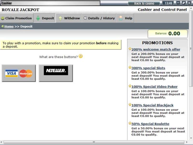 O sistema bancário do Royale Jackpot Casino é um pouco limitado, mas isso é de se esperar, já que o cassino utiliza o software da Rival. O cassino oferece suporte para depósitos e saques via Neteller, depósitos via Visa e MasterCard, e saques via transferência bancária. A velocidade dos saques também não é das mais rápidas, pois há um período de espera de 48 horas e os pagamentos podem levar até uma semana para serem creditados em sua conta.