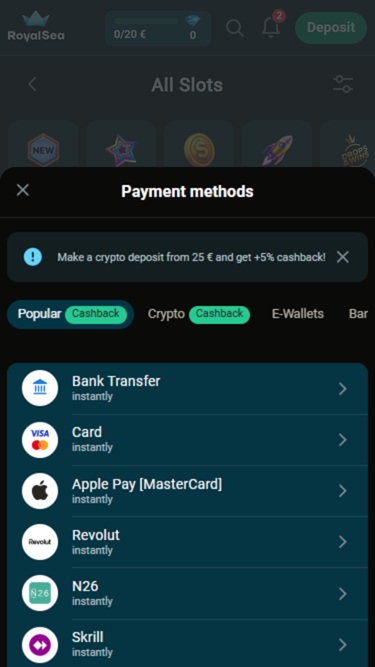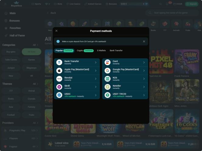 Se você gosta de jogar jogos de cassino em seus dispositivos portáteis, prepare-se para muita diversão, pois este cassino é otimizado para jogos em dispositivos móveis. Caso prefira usar um computador, você também poderá explorar o conteúdo do RoyalSea. Lembre-se apenas de que, em ambos os casos , uma conexão de internet estável garantirá uma experiência de jogo ininterrupta e tempos de carregamento rápidos.