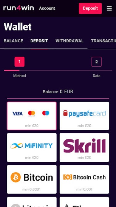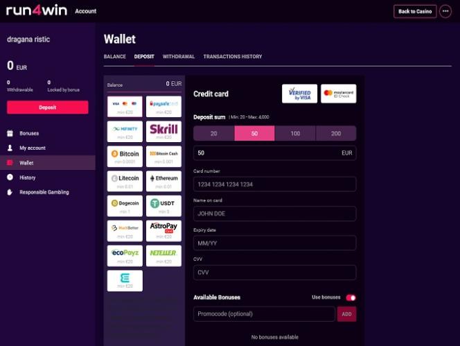 O Run4Win Casino oferece uma ampla variedade de opções bancárias, permitindo que os jogadores utilizem criptomoedas como método de pagamento, além de outros métodos populares como Visa, Mastercard, Neteller, Skrill, transferência bancária , Astropay e outros.