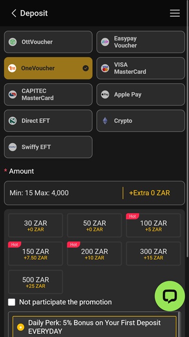 Os jogadores sul-africanos também terão o prazer de explorar a seção de apostas esportivas da marca, que oferece uma ampla gama de opções de apostas e eventos esportivos, incluindo esportes virtuais e apostas ao vivo. A plataforma de apostas esportivas é enorme e atenderá até mesmo aos veteranos mais experientes.