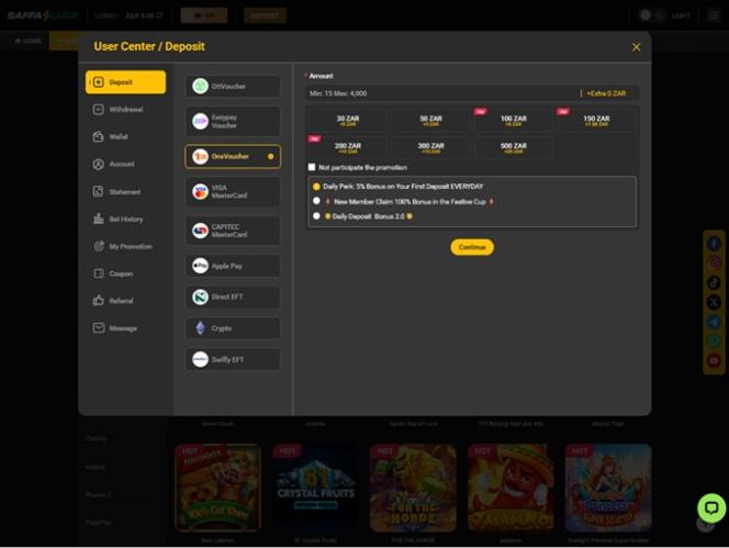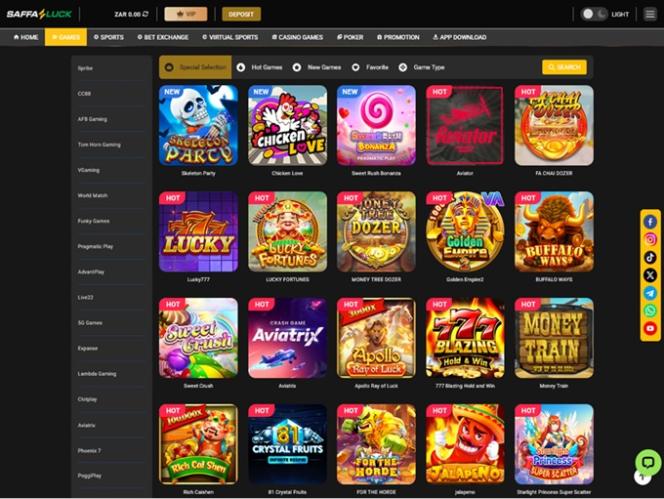 Como o próprio nome sugere, o SaffaLuck é um cassino online que aceita principalmente jogadores da África do Sul e visa atrair um grande público oferecendo uma seleção impressionante de jogos de cassino e opções de apostas esportivas, incluindo centenas de caça-níqueis com dinheiro real , jogos instantâneos, dealers ao vivo e jogos de mesa, além de uma ampla gama de promoções e bônus.