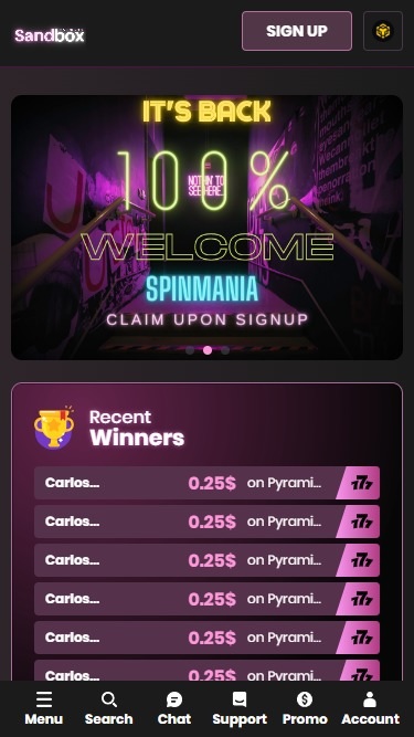 O site SandBox é otimizado para diversos dispositivos, então os apostadores que preferem jogar confortavelmente do sofá certamente irão apreciar essa opção. A versão para desktop é igualmente bonita, mas esta versão da página inicial foi projetada para exibir todo o conteúdo do cassino online alinhado à esquerda, o que dá a impressão de que algo está faltando na página. Isso reduziu um pouco nossa impressão geral. Outras páginas usam uma exibição diferente, então não há com o que se preocupar. À primeira vista, o SandBox parece ser um lugar incrível para jogar.