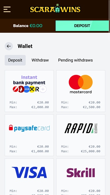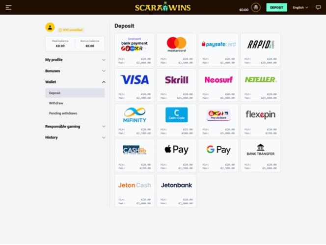 Para quem está se perguntando se o cassino Scarawins aceita criptomoedas, infelizmente a resposta é não. Mas o departamento financeiro oferece diversos métodos de pagamento populares , incluindo Apple Pay, transferência bancária, MiFinity , Skrill, Neteller, Visa e MasterCard, entre outros.