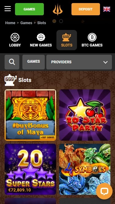 Os jogos estão divididos em seções bem organizadas: Caça-níqueis, Jogos BTC, Jackpots, Vídeo Poker, Loteria, Cassino ao Vivo…