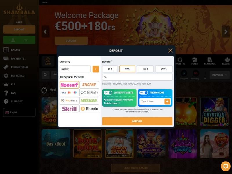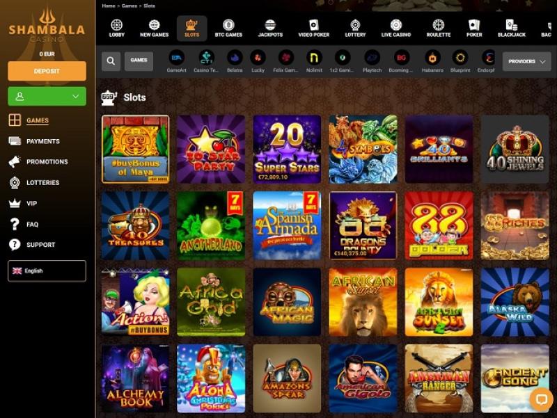 É fácil reconhecer um cassino que se preocupa com os jogadores, basta observar a seleção de jogos que oferece em seu catálogo. A lista de fornecedores de software de cassino diz muito sobre o esforço que o operador dedica para satisfazer as necessidades de jogo dos jogadores. Com a tecnologia da SoftSwiss , o Shambala também tem parcerias com: NetEnt, Playtech, Spinomenal, Evolution e outros.